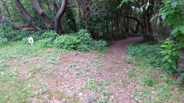 森への入口は、ソロ・デュオサイト76番の横手にある歩道を入って行きましょう。あまり人通りが無いんでしょうね、蜘蛛の巣があちらこちらに。