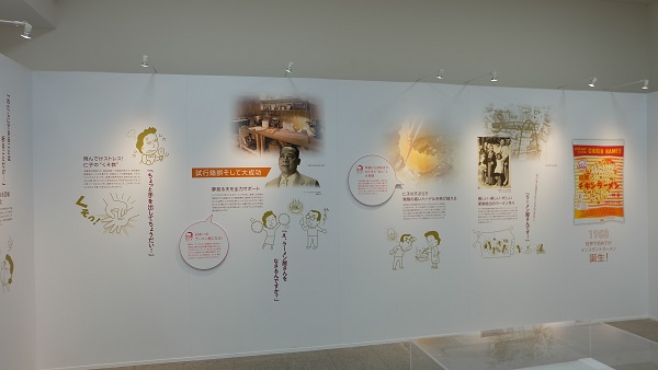 年代順にインスタントラーメン発明のエピソードや発展の歴史を見て触って動かせる展示ブース。
