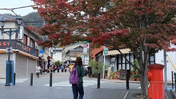 駅前辺りは飲食店やもみじの天ぷらなどのお土産屋が建ち並んでいます。