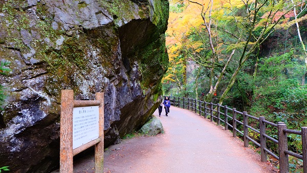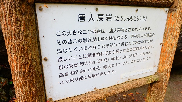 唐の貴人も怖れた大きな岩、唐人戻岩(とうじんもどりいわ)を横目に進み滝を目指します。
