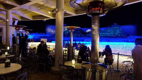 しかし、展望台の1階に行くとレストランがあり、ここは壁が無くイルミネーションを眼前に観る事ができる上、席にはストーブが付いているので暖を取りながらゆっくり鑑賞する事ができるので非常にオススメです!