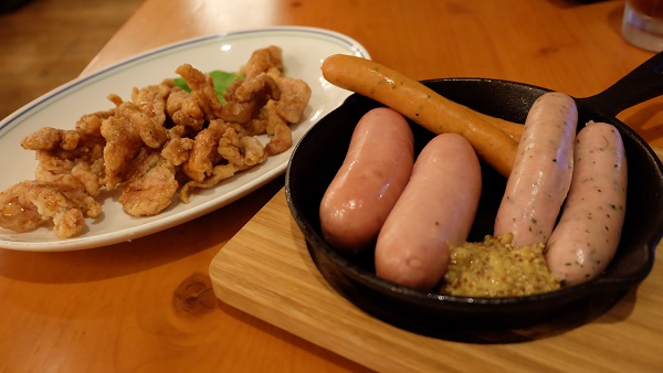地ビールのお供に注文したのは、ソーセージの盛り合わせ(950円)と、やみつきチキンの名古屋味(650円)です。