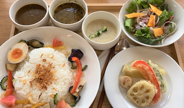 カレーは牛すじ、野菜、冷製の3種類。野菜カレーはかなりマイルドで、牛すじの方がスパイシーで美味しかったです(みち談)。天ぷらとおからのコロッケをトッピングしてみました。